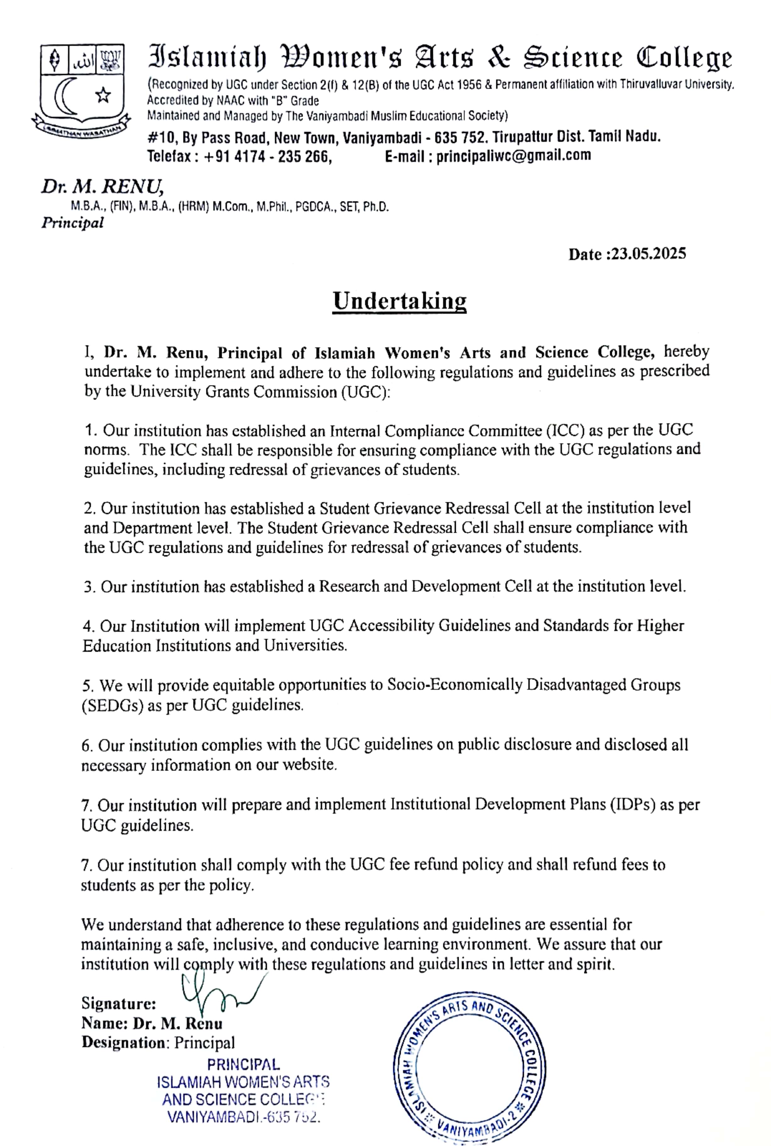 Islamiah Women’s Arts and Science College is a self-financing college, established in 1997 with the aim of imparting higher Education for Women. The Institution is Maintained and Managed by Vaniyambadi Muslim Educational Society (VMES), Vaniyambadi. The College is approved by the Government of Tamil Nadu and recognized by UGC, u/s 2(f) and 12(B) of the UGC Act 1956. It is permanently affiliated with Thiruvalluvar University.